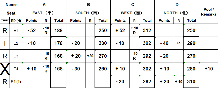 R-section: Whoever Riichi-ed, write R IMMEDIATELY. So you will not missed out. Notice that there are now numbers written on top of the R. This is to indicate whether that player has lost his riichi deposit or gain other players’ riichi deposit. (See E1 and E3 for example) if the player who riichi-ed is the winning player, there is no need to write anything else beside a “R” (See E2 for example). ALL Riichi sticks transaction are under this column, including one that is from previous hand. (See E4 (1) for example)