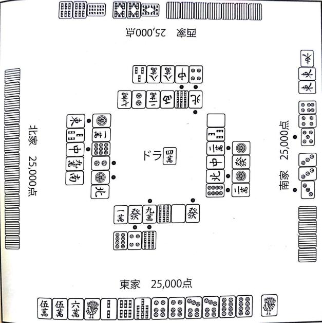 On the board, the south player has at most 3-han (wind + honitsu OR wind + 2-dora faking hon itsu), the west player has at most 7-man on chinitsu + toitoi and the north is likely tanyao (as I said, I’m a beginner so that’s all I can see).